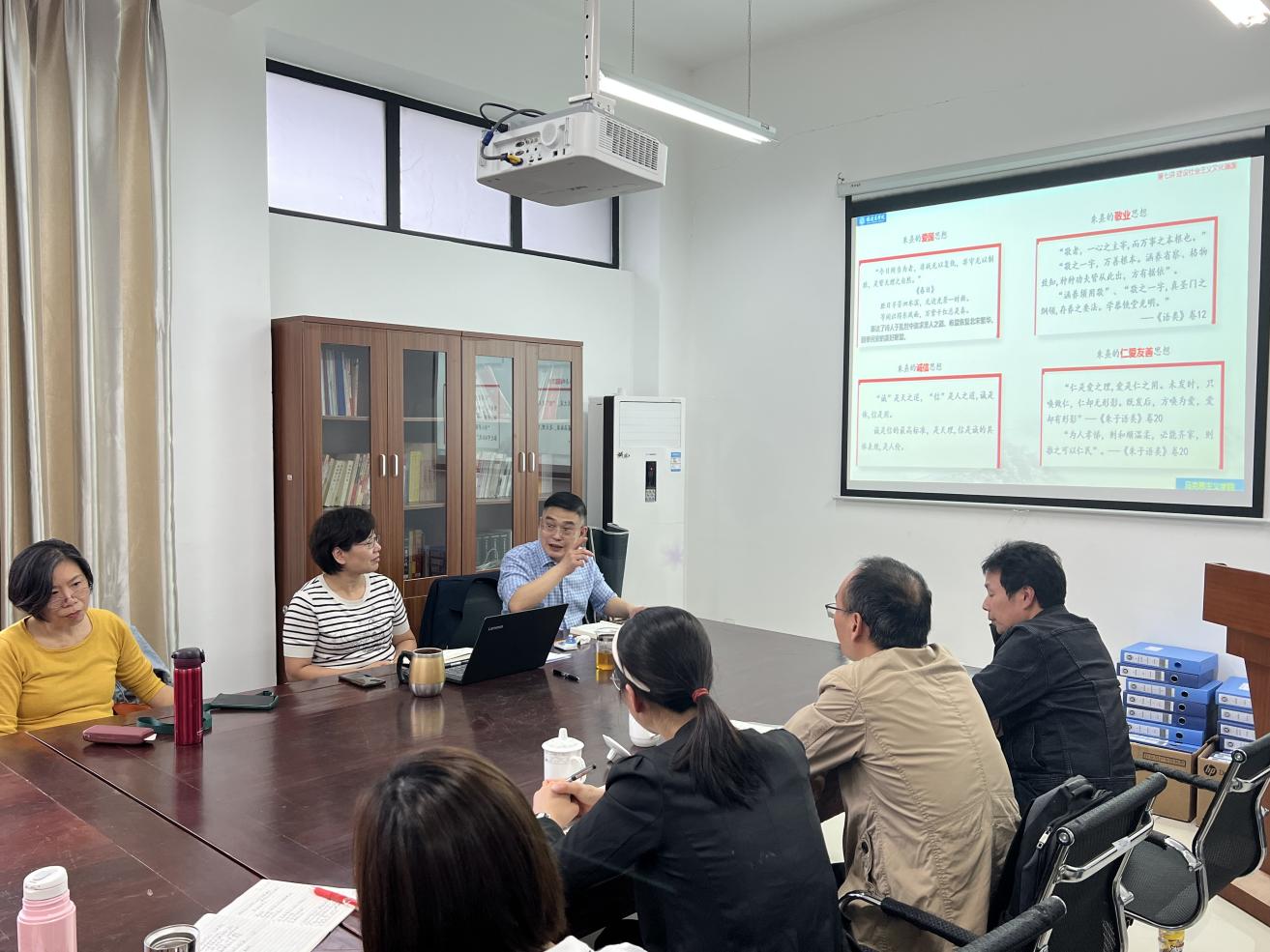 本次集体备课会的专题是《建设社会主义文化强国》,马克思主义学院的黄小勤老师、陈火荣老师、谢东俊老师分别以《意识形态工作是党的一项极端重要的工作》《弘扬传承朱子文化,践行社会主义核心价值观》《文化虚无主义的表现和本质》为题作了分享。