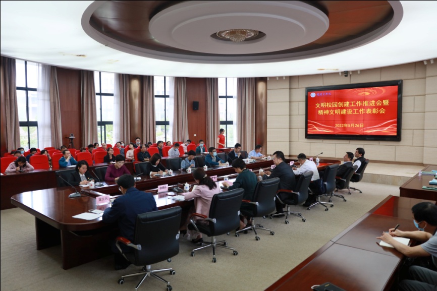 5月26日上午,bsport官网文明校园创建工作推进会暨精神文明建设工作表彰会在连江校区视频会议室召开。校党委书记刘剑津出席会议并讲话,校领导程灵、吴访益、杨晓翔、蒲文庆、萧罡,各机关部门负责人、二级学院党政负责人、受表彰个人和文明校园创建联络员参加会议。会议由校党委副书记徐晓丹主持。