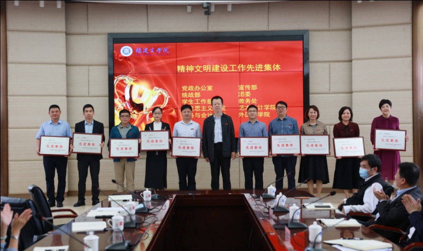 校党委书记刘剑津在讲话中充分肯定了学校精神文明建设及文明校园创建工作成效。他强调,要以习近平新时代中国特色社会主义思想为指导,高举思想旗帜、聚焦主题主线、突出价值引领,实施提高效率、提升效能、提增效益行动,坚持“两手都要抓、两手都要硬”,不断推动新时代学校精神文明建设高质量发展,为推进特色鲜明的区域高水平商科大学建设提供强大精神动力。并就做好当前和今后一个时期学校精神文明建设工作,刘剑津提出三点意见:一要提高站位,持续深化对精神文明建设的思想认识。要把精神文明建设贯穿于推动高质量发展全过程,与深入学习贯彻习近平总书记系列重要讲话精神和党的十九届六中全会精神相结合,与党的建设、作风建设、宣传思想政治工作、巩固拓展党史学习教育等重点工作相结合,打造好商学院新风正气福建“名片”。二要把握重点,持续巩固精神文明建设工作成果。要以争创全国文明校园为目标,持续抓好习近平新时代中国特色社会主义思想学习贯彻;构建具有福商特色的校园文化品牌,打造优美校园;落实意识形态工作责任制,营造安全稳定、文明和谐的校园氛围;培育文明风尚,加强师德师风建设和志愿服务。三要真抓实干,持续推动精神文明建设工作再上新台阶。要牢固树立一盘棋思想,既要各司其职、各负其责,又要协同作战、合力攻坚,推动形成人人参与、共建共创的工作格局,使精神文明建设接地气、得人心、上台阶。