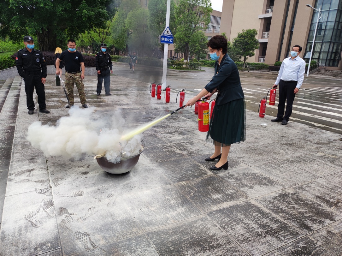 本次演练包含地震紧急避险及疏散、防汛疏散转移、紧急救治、反恐处突、灭火实操、落水救援、疫情防控演练等七项内容。在灭火实操中,校领导与学生代表一起在指导老师的讲解下,手提灭火器,动作规范地扑灭了火源。