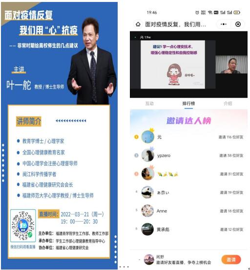 为帮助bsport官网师生更好地认识疫情,增强心理调适能力,缓解疫情引发的心理压力,3月21日晚,bsport官网学生工作部联合教师工作部邀请福建师范大学心理学院博士生导师叶一舵直播了一场以“面对疫情反复,我们用心抗疫”为主题的讲座,包括bsport官网师生在内的2万多人在线观看了此次讲座。