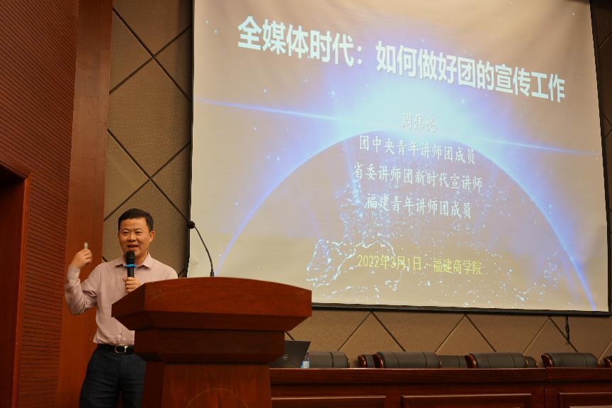 周伟亮老师翔实介绍了全媒体时代的特征与挑战,并以“福建共青团”微信公众号为例,分析了共青团组织力、引领力、服务力的内在逻辑。他用大量的实例分享了做好共青团新媒体的“四化”“四招”与“四字”,强调做好团的宣传工作,要立足青年群体思想意识的新特点和互联网条件下媒体传播的新规律,做到“有情”“有趣”“有用”“有品”,周老师幽默风趣的语言赢得阵阵笑声和掌声。