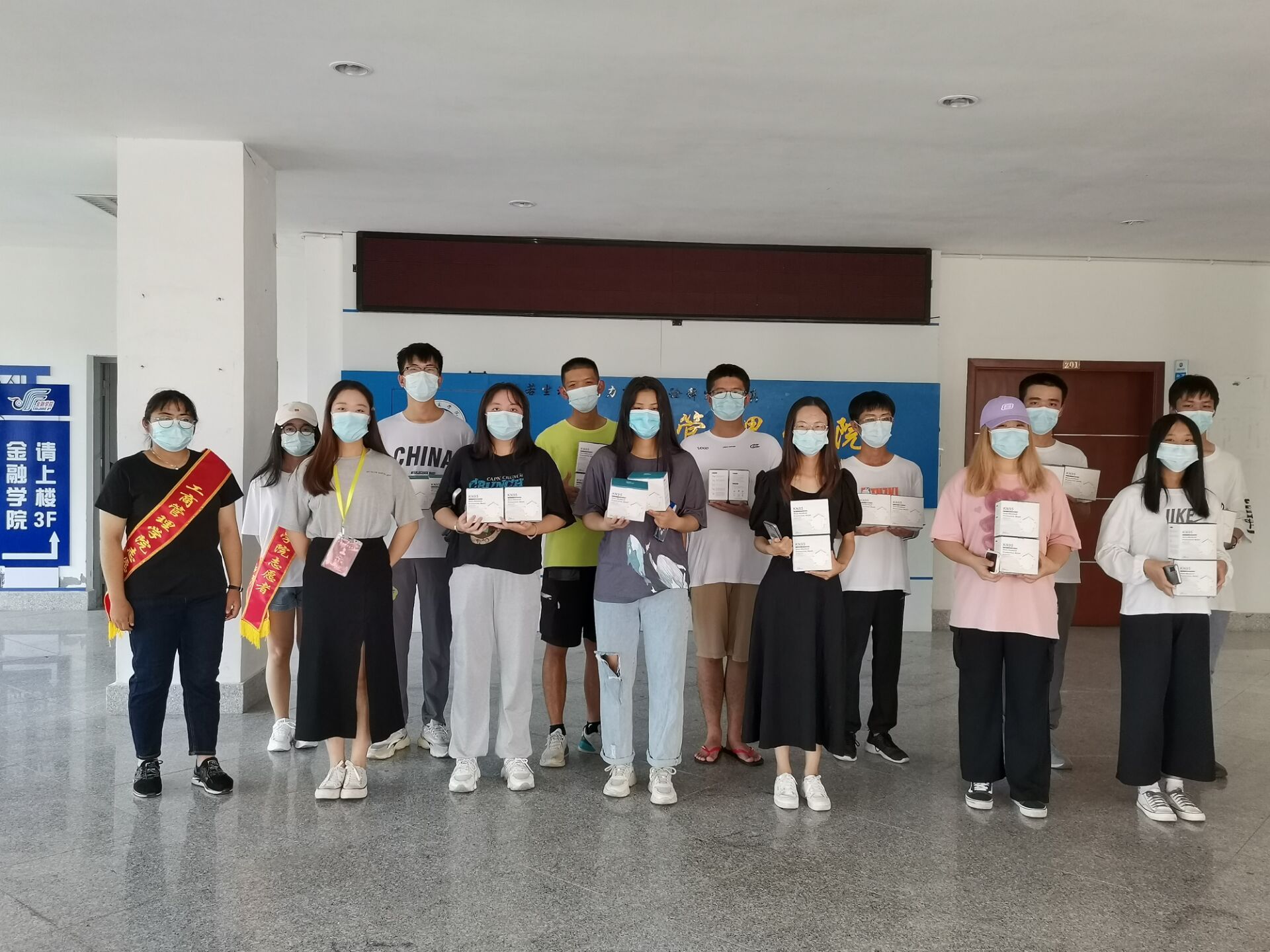 学生领取校友捐赠的口罩