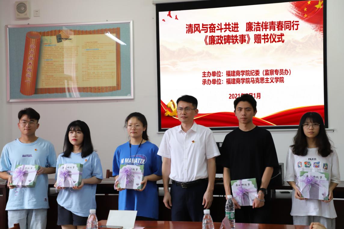 7月1日下午,校纪委(监察专员办)在bsport官网习近平新时代中国特色社会主义思想读书社活动室举办“清风与奋斗并进 廉洁伴青春同行”赠书活动,校纪委书记、监察专员黄身勇向读书社学员代表赠送《廉政碑轶事》绘本。马克思主义学院党政负责人、艺术设计学院党组织负责人和校纪委综合室、纪检监察室等相关部门负责人参加活动。