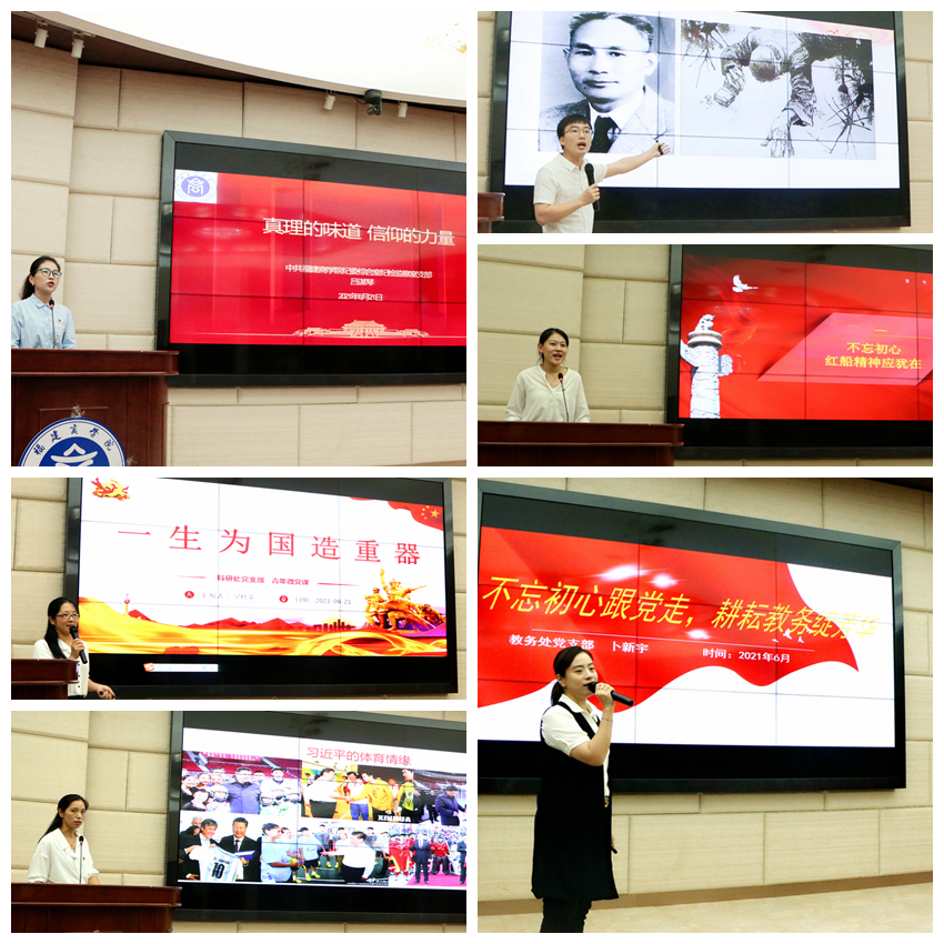 校党委书记刘剑津、党委副书记吴访益和机关党务干部参加了活动。机关21个党支部都派出了党员参赛,比赛围绕“学习贯彻落实习近平新时代中国特色社会主义思想”“学百年党史,当奋斗先锋”“如何做一名合格党员”“青年党员的担当使命”等四个方面进行,以微型党课的形式,用小故事诠释大道理,以小话题撬动大主题。参加的党员紧紧围绕主题,从自身岗位出发,与实际工作相结合,用生动的事例、动情的讲述,通过PPT、视频、音频等多媒体形式展示内容,用坚定的声音传播中国共产党所取得的伟大成就。