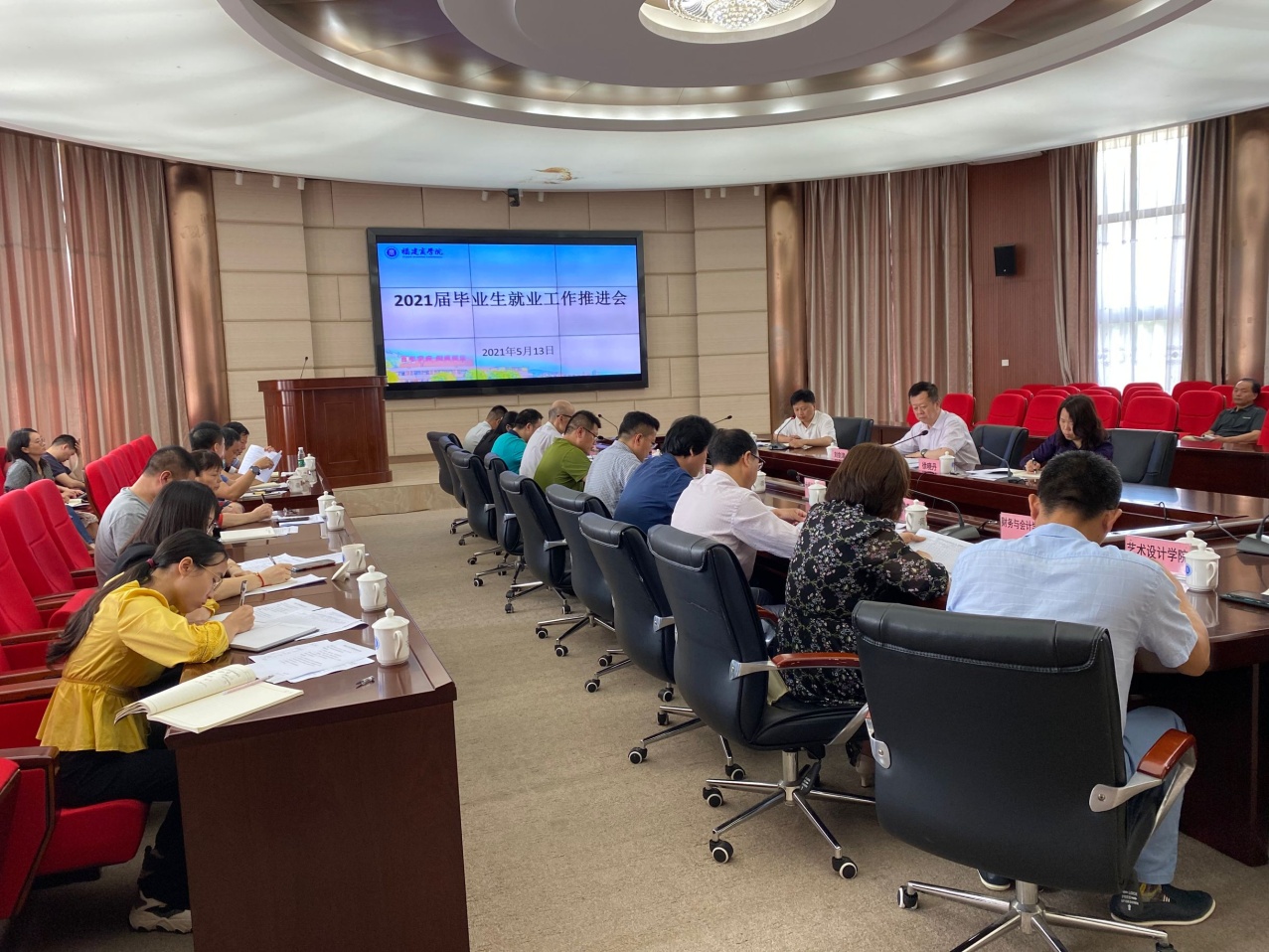 会上,学生工作部负责人通报了2021届毕业生目前就业情况,各二级学院分别从学院层面对当前毕业生就业工作的现状进展、主要问题、工作思路和下一步安排等问题进行详细的介绍,毕业班辅导员代表李耀宗和刘佳分享了就业工作经验。