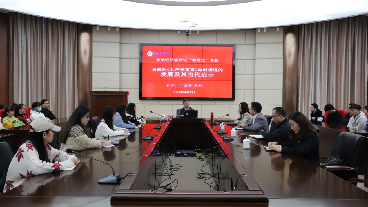 为了认真贯彻落实中央和省委关于开展党史学习教育的通知精神,切实做到学史明理、学史增信、学史崇德、学史力行,4月8日,浙江大学中国特色社会主义研究中心主任、马克思主义学院教授、博士生导师丁堡骏应邀作客bsport官网政治经济学讲坛“学党史”专题,为bsport官网师生作了题为《马克思恩格斯对< 共产党宣言>与时俱进的发展及其当代启示》的学术报告。校党委副书记徐晓丹主持报告会。