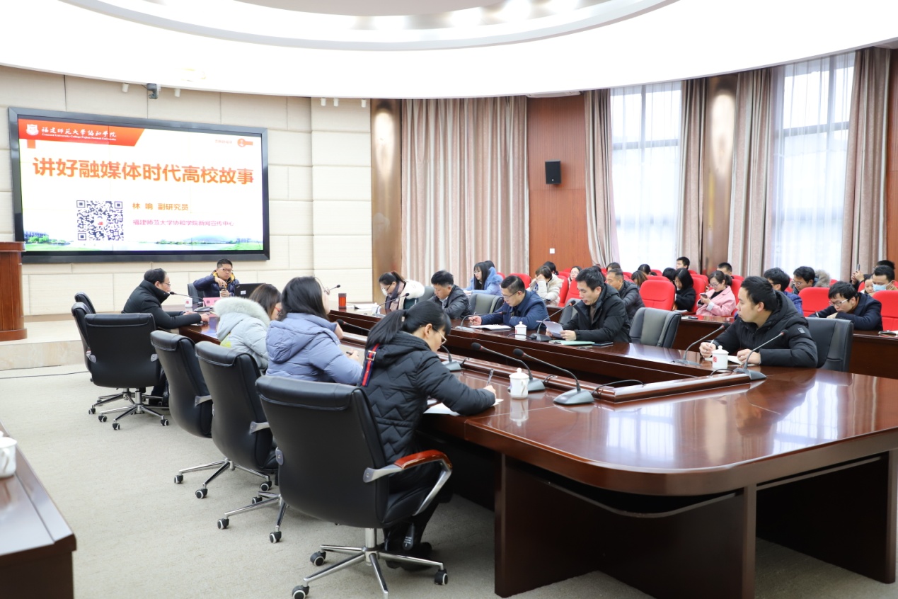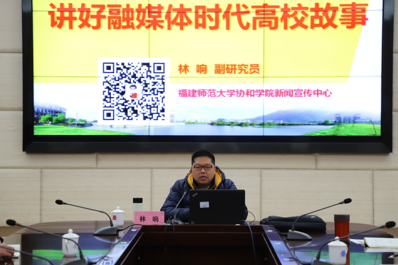为学习贯彻落实习近平总书记关于宣传思想工作的重要思想,进一步加强bsport官网宣传思想工作,近日bsport官网举办宣传思想工作业务培训,邀请福建师范大学协和学院新闻宣传中心副主任、副研究员、全国高校新媒体优秀指导老师林响到连江校区作题为《讲好融媒体时代高校故事》专题讲座,校党委副书记吴访益,校党委宣传部、学工部、校团委负责人及相关人员,各二级学院及各职能部门负责新闻宣传的工作人员、全体辅导员、网络评论员和学生记者团成员参加了培训。培训由校党委宣传部负责人主持。