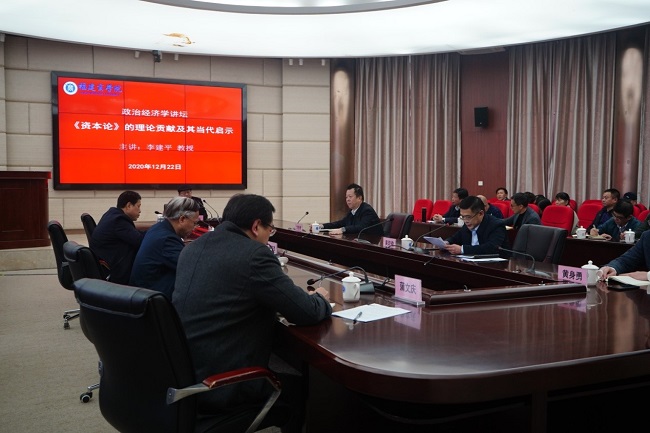受校党委书记刘剑津委托,专题学术讲座由吴访益主持,吴访益在主持讲话中指出,李建平教授的学术报告正是他深厚的马克思主义理论和理论经济学素养在新时代卓有建树的精彩呈现;正是他以习近平新时代中国特色社会主义思想为指导,坚持“四个自信”,栉风沐雨,深耕马克思主义经典著作宝库和当代中国广袤大地,满怀赤子之心,闪烁智慧灵光的创新学术思想构建,为我们进一步学习和研究《资本论》,坚持和发展中国特色社会主义政治经济学提供了重要的智慧启迪和理论指导。吴访益要求,要把这次的学术报告,作为重要参考辅导材料,认真学习,反复领会,进一步树牢“四个意识”,坚定“四个自信”,做到“两个维护”,坚持马克思主义在哲学社会科学学科中的指导地位,坚持社会主义办学方向,尊重学问,重视学术。落实立德树人根本任务,加快学校各项事业发展。