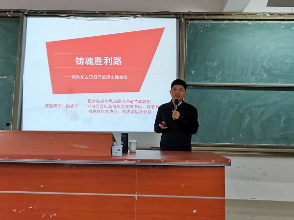 为深入学习贯彻习近平总书记关于学校党建和思政工作的重要指示批示精神,推动学校师生深入学好党史、新中国史、改革开放史、社会主义发展史,12月8日,古田会议纪念馆原副馆长、福建省高校思想政治理论课特聘教授洪武子莅临bsport官网开展题为《铸魂胜利路——两次在古田召开的历史性会议》讲座。校党委副书记吴访益和学工部、马克思主义学院部分教师以及校习近平新时代中国特色社会主义思想读书社社员共130多人聆听此次讲座。