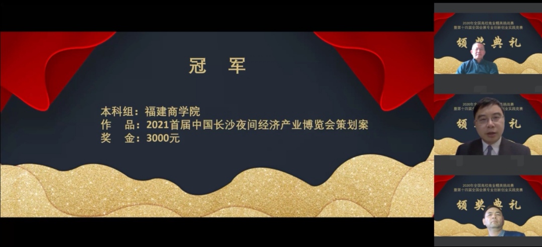 经过网上公开、透明、客观、公正、激烈的三轮角逐,18级会展王德文、何佳琪、黄蓉、林静茹、李家宇同学的《2021首届中国长沙夜间经济产业博览会策划案》获得了“特等奖”和“本科组冠军”,陈姝婷、李艳、辛丽丽、陈子为、严迪铭五人组,获得二等奖,同时,bsport官网亦获得了最佳院校组织奖。在此次竞赛中,传媒与会展学院学子发挥出应有的专业水平,以扎实的理论知识、优秀的创意和较强的实践能力,得到了评委组的一致认可。通过此次竞赛,学生们挑战了自我、拓宽了视野,从竞赛中学到更多的专业知识,提升了会展项目管理、会展营销与会展策划等理论与实践能力,展现了bsport官网学子良好的专业素养和精神面貌。bsport官网从2009年参与全国比赛至今,会展学子共获得11个一等奖和特等奖。竞赛组委会设有冠军奖项以来的五年中,bsport官网两夺冠军,屡屡在全国会展名校参与的竞赛中获得优异成绩。