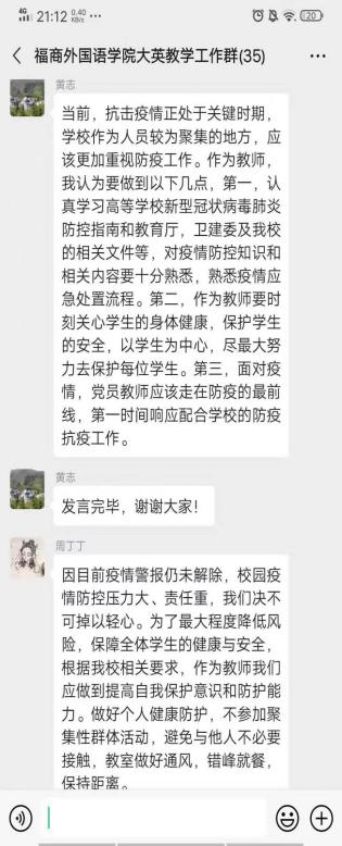 学院各系部分别组织教师进行线上学习交流,认真学习了学校、教务处和学院相关新冠肺炎疫情防控有关要求,组织教师们进行复学疫情防控知识培训与学习,引导教师继续做好线上教学常规工作,加强对线上教学的督导工作,并做好线上考试的培训工作。会上,教师们还分享了疫情防控知识培训的学习体会。