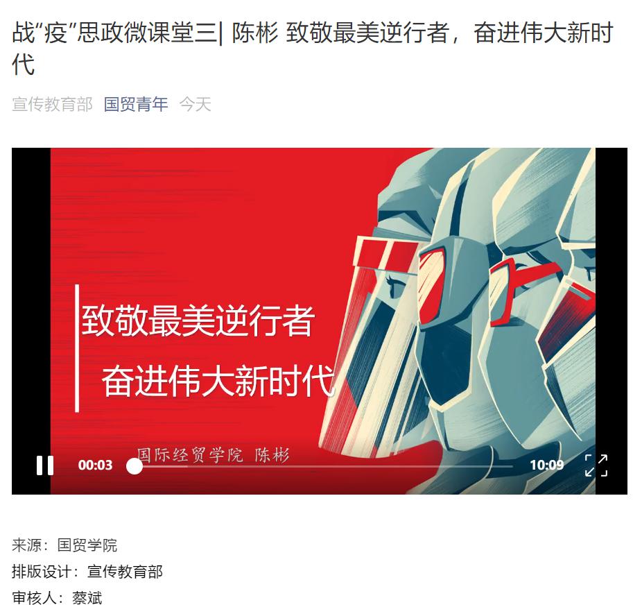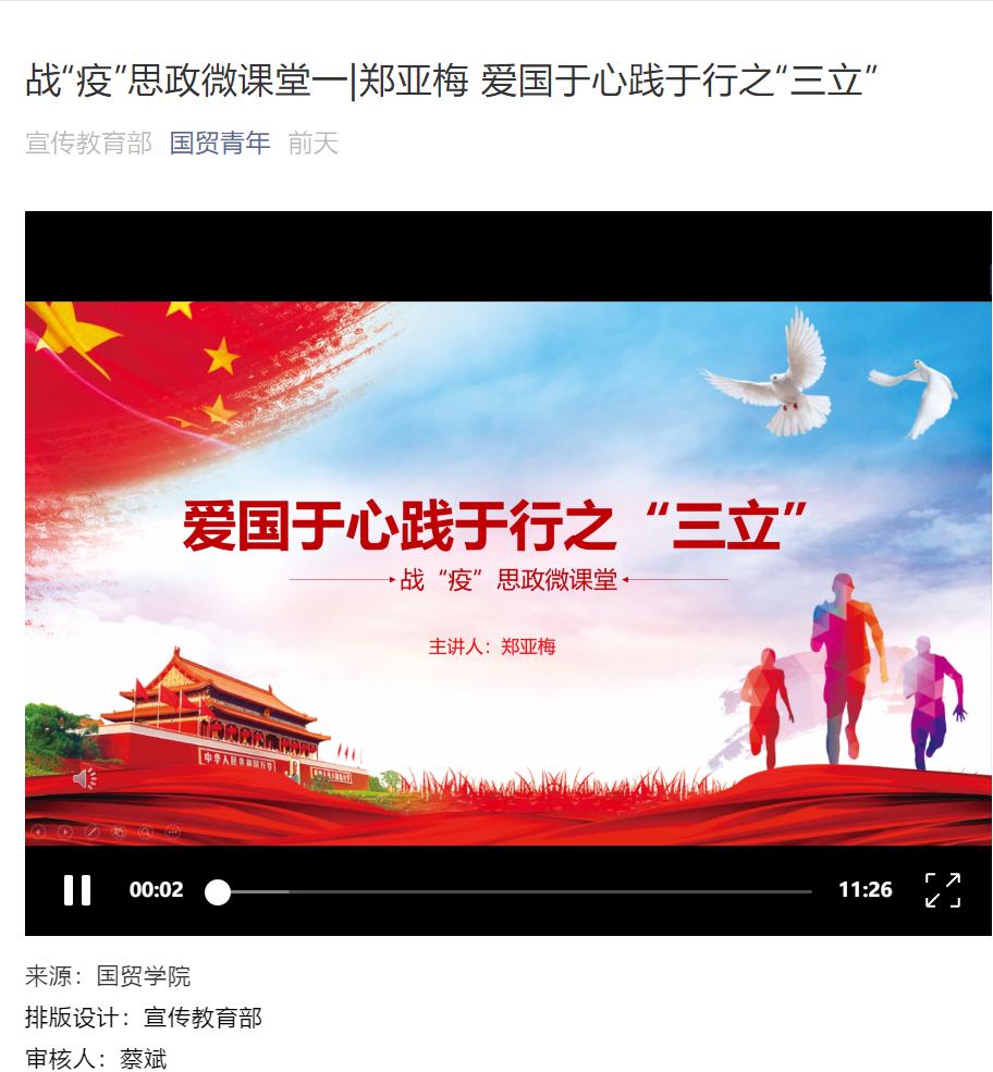 在防控新冠肺炎疫情的关键时期,为宣传全国人民在以习近平同志为核心的党中央坚强领导下齐心协力抗击疫情的重大举措、感人事迹、生动故事,充分挖掘其中蕴含的思想政治教育元素,引导青年大学生增强“四个意识”、坚定“四个自信”、做到“两个维护”,坚定打赢这场疫情防控人民战争、总体战、阻击战的信心和决心,深刻认识中国抗疫彰显的中国共产党领导和中国特色社会主义制度的显著优势,教育引导学生弘扬中国精神,国际经贸学院重磅推出战“疫”系列思政微课,为全院坚守在家的1500余名学子呈上了一份优质的思政大餐。