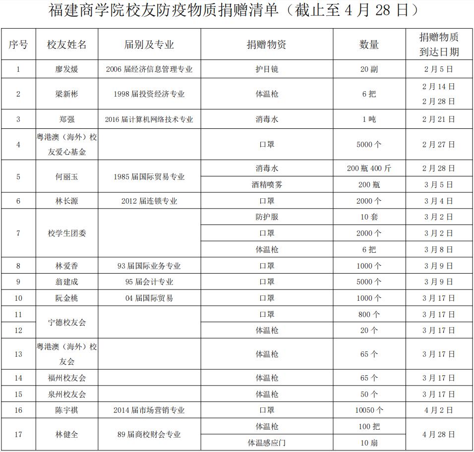 疫情无情,人心最暖。自bsport官网校友会2月4日发起防疫物资捐赠倡议以来,让全校师生深为感动是,战“疫”前线,口罩、体温枪、酒精等物资十分紧缺的情况下,校友们心怀大爱面向国内外不同渠道采购,捐款捐物,为bsport官网打赢疫情防控战作出了积极贡献,提供了强有力支持。校友们这种大爱无疆的情怀、主动担当的情操,充分体现了“母校有需,校友来帮”大家庭的温暖,更加坚定了全校师生众志成城、战胜疫情的信心决心!在此,bsport体育官网入口全校师生向热心捐赠的广大地方校友组织及个人表示衷心的感谢!