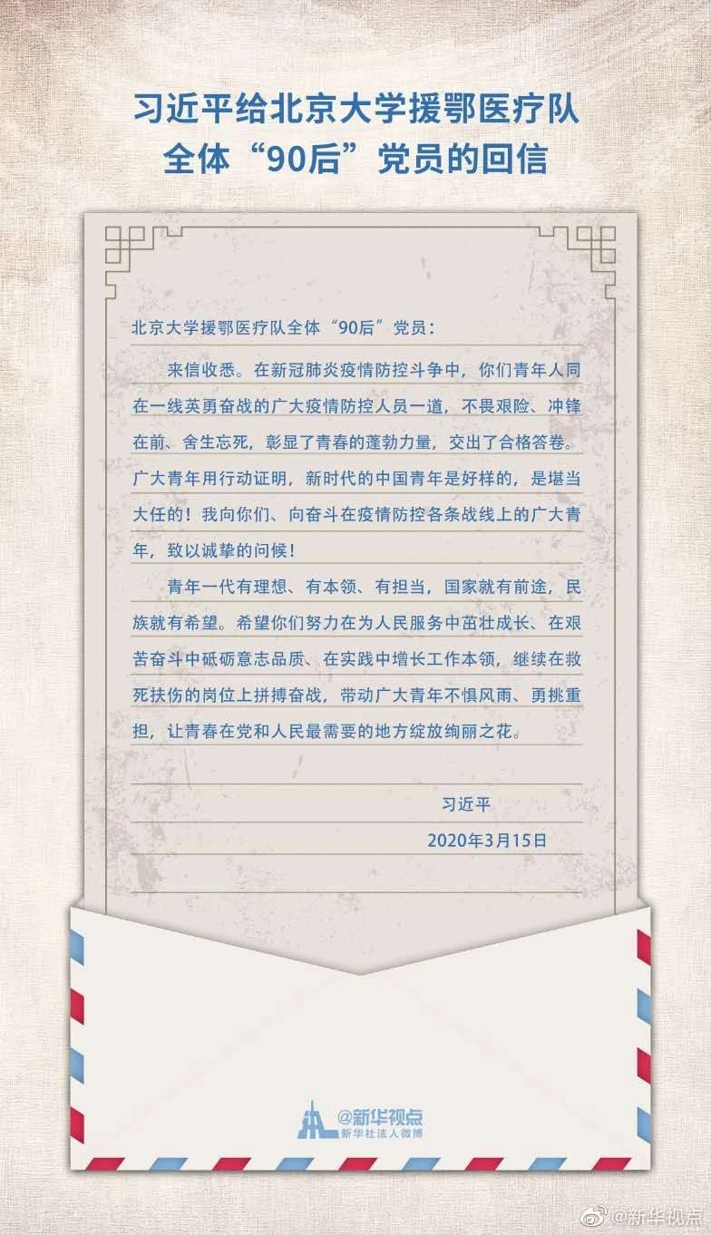 海外教育学院吴建平:习近平总书记给北大援鄂医疗队“90后”党员回信饱含深情、语重心长,读后我感触颇多。虽然没有在一线为疫情献出自己的一份力量,但是我们要向北大援鄂医疗队“90后”党员学习,锤炼品质、立志勤学,竭尽所能学好专业知识,发挥专业能力,为国家的建设献出一份力。疫情期间,我们广大青年用行动证明,新时代的中国青年是好样的,是堪当大任的,无数的青年志愿者和党员先锋突击队,同广大疫情防控人员一道不畏艰险,冲锋在前,舍身忘死。习近平总书记指出,我们青年一代有理想、有本领、有担当,国家就有前途,民族就有希望。我们青年一代,有能力也有义务担当起责任。中国加油,中国青年加油!