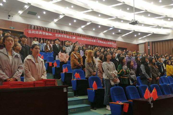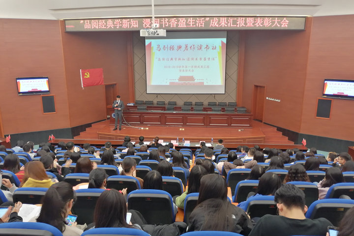 12月19日下午,bsport官网马列经典著作读书社“品阅经典学新知 浸润书香盈生活”学期读书成果汇报暨表彰大会在马尾校区学术报告厅举行,本次活动由马克思主义学院主办、金融系学生党支部承办。马克思主义学院、金融系、国际经济与贸易系的相关老师,各院系读书社社员代表等200多人参加活动。
