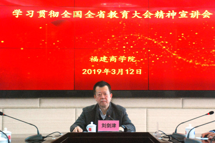 刘剑津指出,教育是国之大计、党之大计,是民族振兴、社会进步的重要基石,关系着人民幸福、社会稳定、国家发展、民族复兴。全国教育大会总结了新时代中国教育改革发展的成就和经验,提出了新理念、新思想、新观点,是一次“写入历史、进入人心、改变生活、开启未来”的大会。全省教育大会的召开,是福建省对习近平总书记关于教育的重要论述和全国教育大会精神的进一步落实,为建设教育强省,办好人民满意的教育提供强大支撑。作为教育工作者,要深刻认识领会全国全省教育大会的精神实质,认真贯彻落实习近平总书记关于教育的重要论述和全国教育大会精神,把握习近平总书记关于“福建没有理由不把教育办好,也确有条件把教育办好”的重要指示精神,全面准确理解于伟国书记在全省教育大会上的重要讲话精神,切实担负起做好高校教育工作的责任和使命担当,切实将大会精神落细落实。