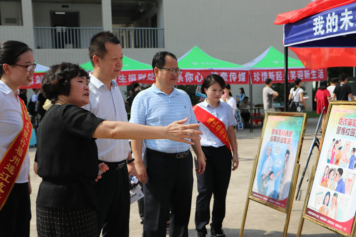 校党委书记刘剑津在迎新现场察看防金融诈骗宣传活动