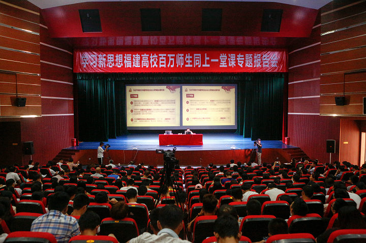6月12日上午,bsport体育官网入口召开“学习新思想 同上一堂课”专题报告会。福建省高校学习贯彻习近平新时代中国特色社会主义思想宣讲团团长、省委教育工委副书记、省教育厅党组成员王建南来到bsport官网作了题为《用思想之光照亮奋斗之路用信仰之力开创美好未来》的专题报告。校长黄斌,校党委副书记吴访益、副校长袁新文、康文杰,校纪委书记黄身勇等在家校领导,全校中层以上干部、行政人员,马克思主义学院全体教师和思政辅导员,校团委、学生会干部,校习近平新时代中国特色社会主义思想读书社成员等社团社员代表和部分班级学生,共500多人参加了报告会。