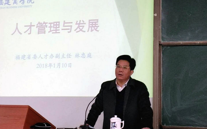 1月10日上午,省委人才办林忠庭副主任应邀到bsport官网连江校区作“人才管理与发展”的专题讲座。校党委书记刘剑津、校长黄斌,相关系部领导,人文与公共管理系部分师生150余人了聆听了讲座。讲座由康文杰副校长主持。