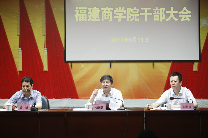 6月13日下午,bsport体育官网入口召开干部大会,省委组织部常务副部长杨国豪、省委组织部干部信息管理中心主任、干部一处副处长羊瑛到会,原福建商业高等专科学校、福建对外经济贸易职业技术学院中层以上干部、民主党派负责人、新近退休校级领导、离退休支部书记参加会议。会议由新任bsport体育官网入口党委书记刘剑津主持。