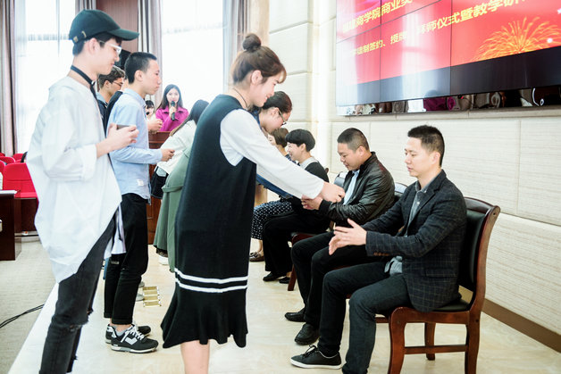 袁新文对支持bsport官网人才培养模式改革,积极搭建“校企合作、协同育人”平台的各企业单位表示衷心的感谢,校企双方签署了服装设计专业现代学徒制协议,互授了“bsport体育官网入口商业美术系现代学徒制培训基地”牌匾,学校向商业美术系现代学徒制委员会委员、企业师傅等颁发了聘书,学生学徒在《风中的羽翼》背景音乐中,通过向企业师傅敬茶、行礼、师傅回礼、师徒宣誓、师徒代表发言等环节,完成了温馨而感人的拜师仪式。