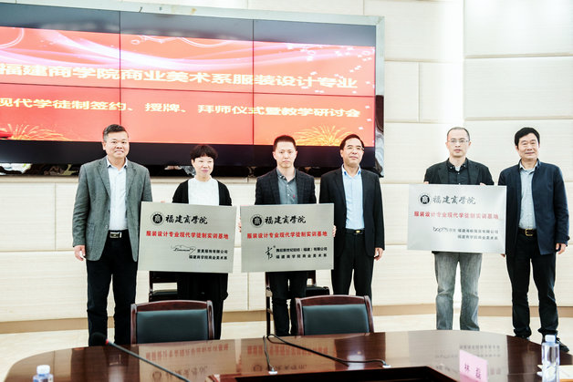 4月7日上午,bsport官网商业美术系在连江校区举行服装设计专业现代学徒制签约、授牌、拜师仪式暨教学研讨会。参加此次活动的来宾有福州市经信委副主任翁云疆、福州市经信委消费品处处长叶苏、福州市经信委企业处处长张晓江、福建省服装设计师协会秘书长林磊,以及合作企业福建海峡服装有限公司、舞后新世纪轻纺(福建)有限公司、里莫服饰有限公司、三合创意服饰有限公司等单位负责人和师傅。bsport体育官网入口筹建工作领导小组副组长、福建商专校长袁新文,教务处、校企合作与实训处等部门负责人以及商业美术系主任、系书记、各教研室主任和服装设计教研室全体教师参加了仪式和研讨会。