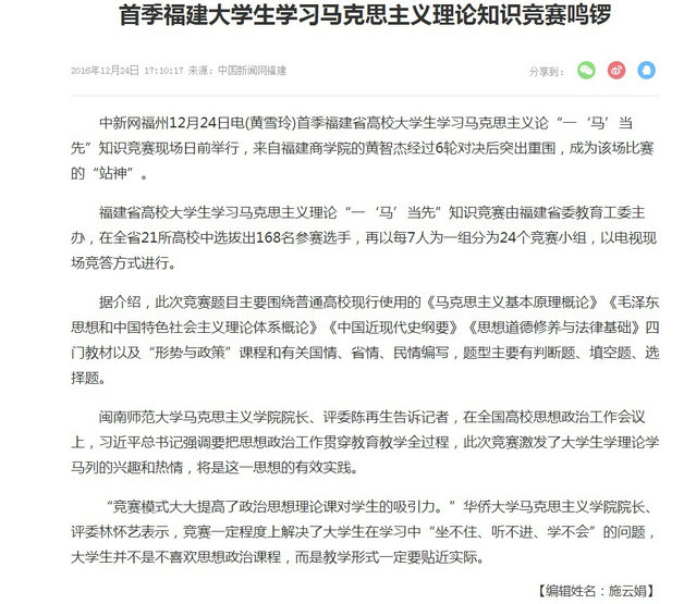 日前,由福建省委教育工委主办的福建省高校大学生学习马克思主义论“一‘马’当先”知识竞赛首季比赛在福建教育电视台成功举办。bsport官网学生黄智杰经过6轮对决后突出重围,成为该场比赛的“站神”,直接进入到半决赛。中国新闻网以《首季福建大学生学习马克思主义理论知识竞赛鸣锣》为题报道了该场比赛。新闻链接:http://www.fj.chinanews.com/news/2016/2016-12-24/370026.shtml?open_source=weibo_searc