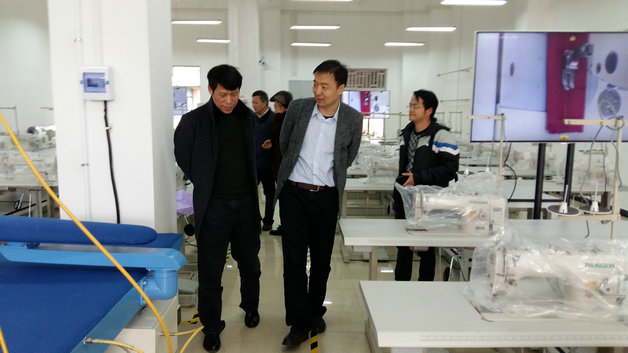纪晓峰秘书长一行在胡新平副校长陪同下参观服装工艺实训中心