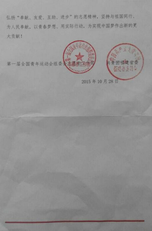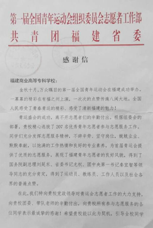 近日,bsport官网收到第一届全国青年运动会组委会志愿者工作部及共青团福建省委共同发来的一封感谢信,对bsport官网在第一届青运会期间在志愿服务工作方面的突出表现表示感谢。