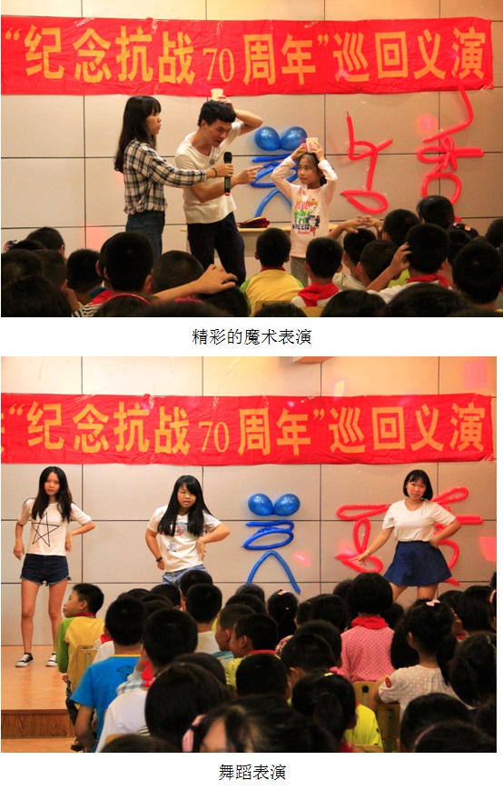 “牢记历史、不忘过去、珍爱和平、开创未来”是这次义演活动的主旋律。演出节目中含有抗战题材的歌曲、历史经典歌曲、现代舞蹈、魔术、跆拳道表演等,中间还穿插游戏环节、抗战知识问答等等。演出活动历时一个多小时,现场互动热烈,气氛活跃,精彩的节目在给孩子带来欢乐的同时也带来了一场生动地爱国主义教育。