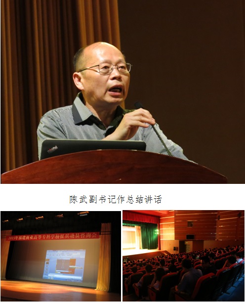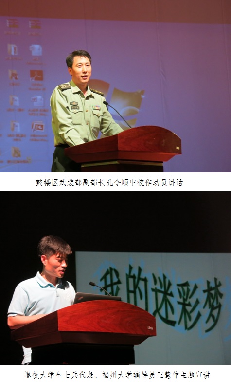孔令顺中校作了动员讲话。他结合自己从军十几年的切身体会,分享了部队培养的优秀品质及荣誉感,号召广大有志青年积极响应国家召唤,积极投身军营,到部队去建功立业。针对今年征兵形势,他详细解读了省、市鼓励大学生入伍多项优抚政策。退役大学生士兵代表、福州大学辅导员王慧作了“我的迷彩梦”主题宣讲。他以切身经历和感悟,讲述了自己携笔从戎,献身军营,由一名大学生成长为一名优秀士兵的历程,分享他从刚入伍时的青涩转变为部队骨干并立功受奖不懈努力的过程,以实例佐证,鼓励大家踊跃入伍。陈武副书记在总结讲话中,从我国当前国内外的军事形势出发,指出大学生参军入伍对我国实现中国梦强军梦的重大战略意义。他认为,大学生参军入伍不仅是我军现代化建设的现实需要,也是大学生立志报国、实现个人成长进步的有效途径。