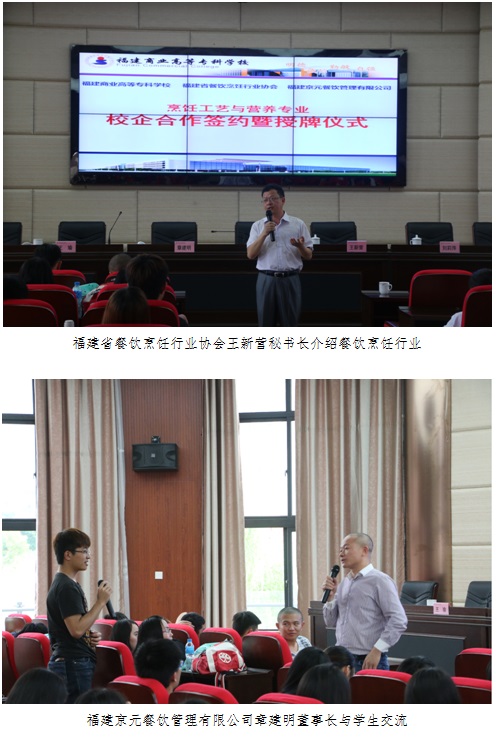 5月8日下午,bsport官网与福建省餐饮烹饪行业协会、福建京元餐饮管理有限公司关于烹饪工艺与营养专业校企合作签约授牌仪式在贵安校区学生活动中心视频会议室举行。福建省餐饮烹饪行业协会秘书长王新营、福建京元餐饮管理有限公司董事长章建明,bsport官网副校长吴贵明、实训处处长刘莉萍、旅游系主任王瑜、旅游系党总支书记王志刚及烹饪工艺与营养专业80余名师生参加了签约仪式。仪式由刘莉萍处长主持。