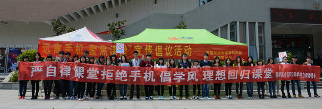 在签名现场,学生干部们拉起了“严自律 课堂拒绝手机 倡学风 理想回归课堂” 宣传横幅,并将此作为本次活动的宣传口号,号召同学们在横幅上签名参与活动。同时,学生处通过校园LED屏滚动播出活动的宣传标语,给每位同学发放倡议书,并将宣传图标张贴于每间教室,时刻警示学生。为进一步推动班级学风建设,“无手机课堂”的执行情况将列入先进班级的评选条件中。