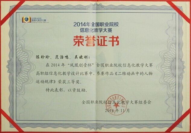 bsport官网商业美术系教师范治鸣、陈珍珍、吴晓刚的教学设计《二维动画——人物运动规律》荣获“高职组信息化教学设计比赛”三等奖。