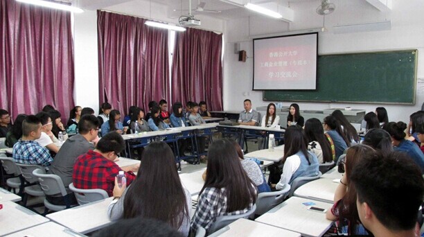 首先,林婷同学就工商管理(专接本)专业课程设置谈了自己的一些感受,认为商专三年的综合英语课程、双语课程、全英语课程、粤语基础课程为他们在香港公开大学本科阶段学习奠定了良好的英文和专业基础,并就如何学好这些课程谈了自己的看法。接着,邢璐同学介绍了香港公开大学的英文笔试、面试要求和操作流程,并就如何做好英文笔试、面试准备工作进行了详细说明。最后,两位学姐就学弟学妹们所关心的各种疑难问题一一做出了细致的回答。交流会气氛宽松,有问必答,传播了正能量。