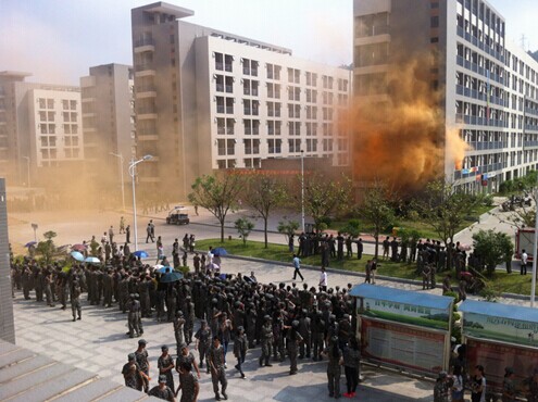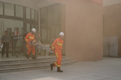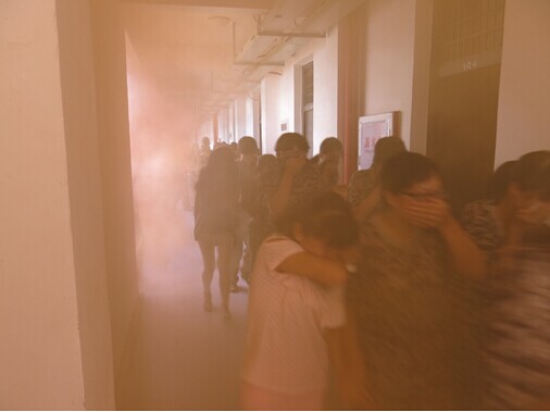 上午9:30,演习正式开始,随着指挥员的一声令下,三号宿舍二楼燃放了烟雾弹,顿时烟雾四起,嘹亮的消防车警报声响彻整个校园。首先是救人,消防官兵用担架救出模拟受伤的学生,宿舍楼的学生在引导员的引导下,口捂毛巾,身体伏弯,井然有序地从三号楼撤离到预定的集中点。同时,物业及保安等义务消防人员从相邻的宿舍楼手提灭火器冲到二楼对起火点进行自救灭火。紧接着,消防官兵连接水带并快速准确地将水喷射向二楼的起火宿舍。随着烟雾散去,掌声响起,此次消防演习活动圆满结束。