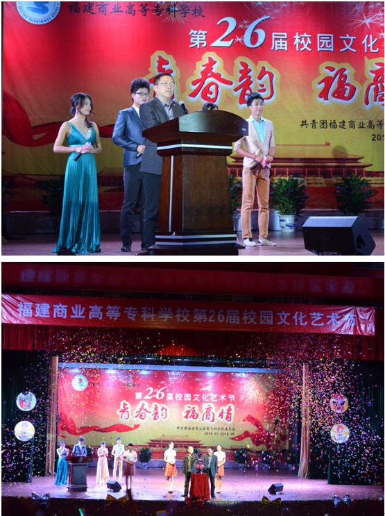 5月6日,福建商专第26届校园文化艺术节开幕式暨十佳歌手决赛在校活动中心隆重举行。校党委副书记黄跃舟,校党委副书记、纪委书记陈武,品沃通讯总经理林健萍,校团委书记应永胜以及各系的党总支书记和团总支书记出席了开幕式。