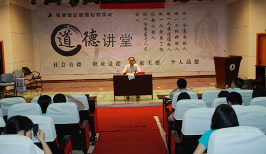校党委副书记黄跃舟主持开讲仪式并做了热情洋溢的讲话。他指出举办“道德讲堂”是bsport官网深入学习贯彻党的十八大精神,扎实推进社会主义核心价值体系建设,不断提升师生道德素质和文明程度,形成良好校园文明风尚的重要平台举措,通过“道德讲堂”建设和活动的开展,进一步推进bsport官网师生公民道德建设工作制度化、体系化,进一步弘扬闽商文化和新时期福建精神,为建设优美和谐幸福的福建商专提供思想保证、精神动力和文化支撑,推动文明学校建设上台阶。