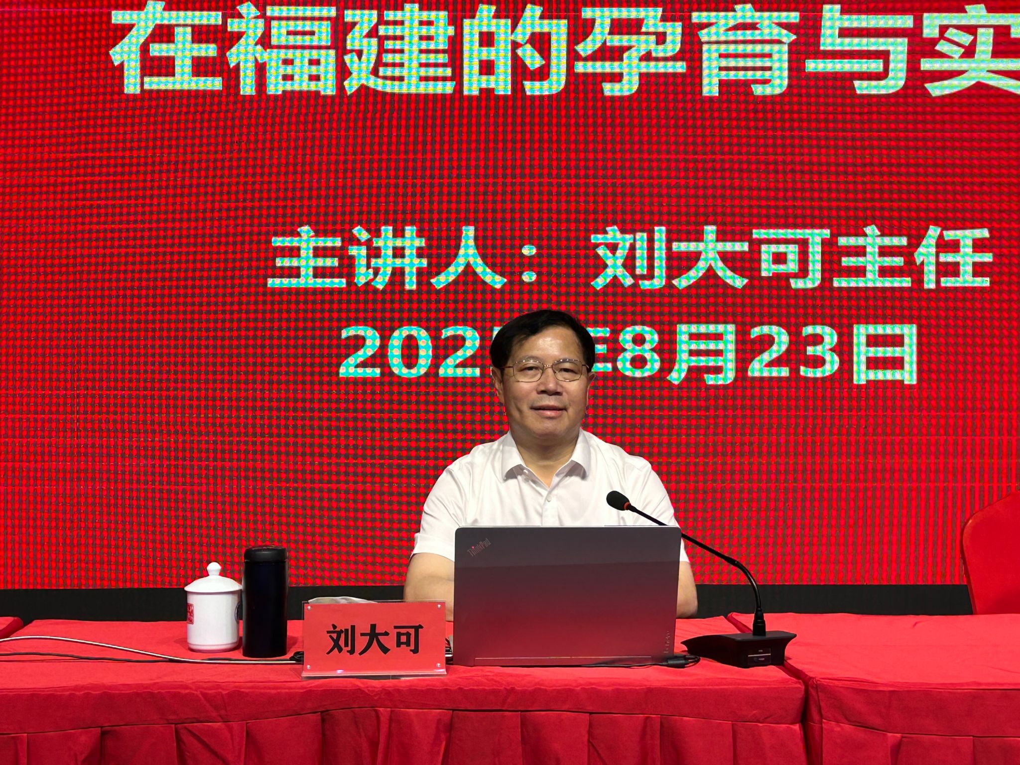 福建省委党史研究和地方志编纂办公室室务会议召集人、主任刘大可作《习近平新时代中国特色社会主义思想在福建的孕育与实践》专题讲座。刘主任从“善谋大局”“正风肃纪”“以人民为中心”“生态文明建设”“精准扶贫”“两岸共圆中国梦”等六个方面,通过详实的事例、透彻的分析,生动阐释了习近平新时代中国特色社会主义思想在福建的孕育与实践。